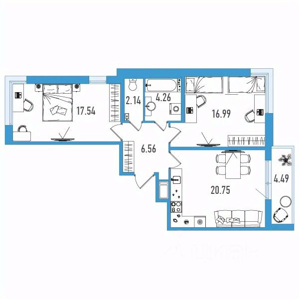 Продаётся 2-комнатная квартира в строящемся доме (Дом 1), срок сдачи: II-кв. 2027, общей площадью 70.49 кв.м., на 2 этаже.