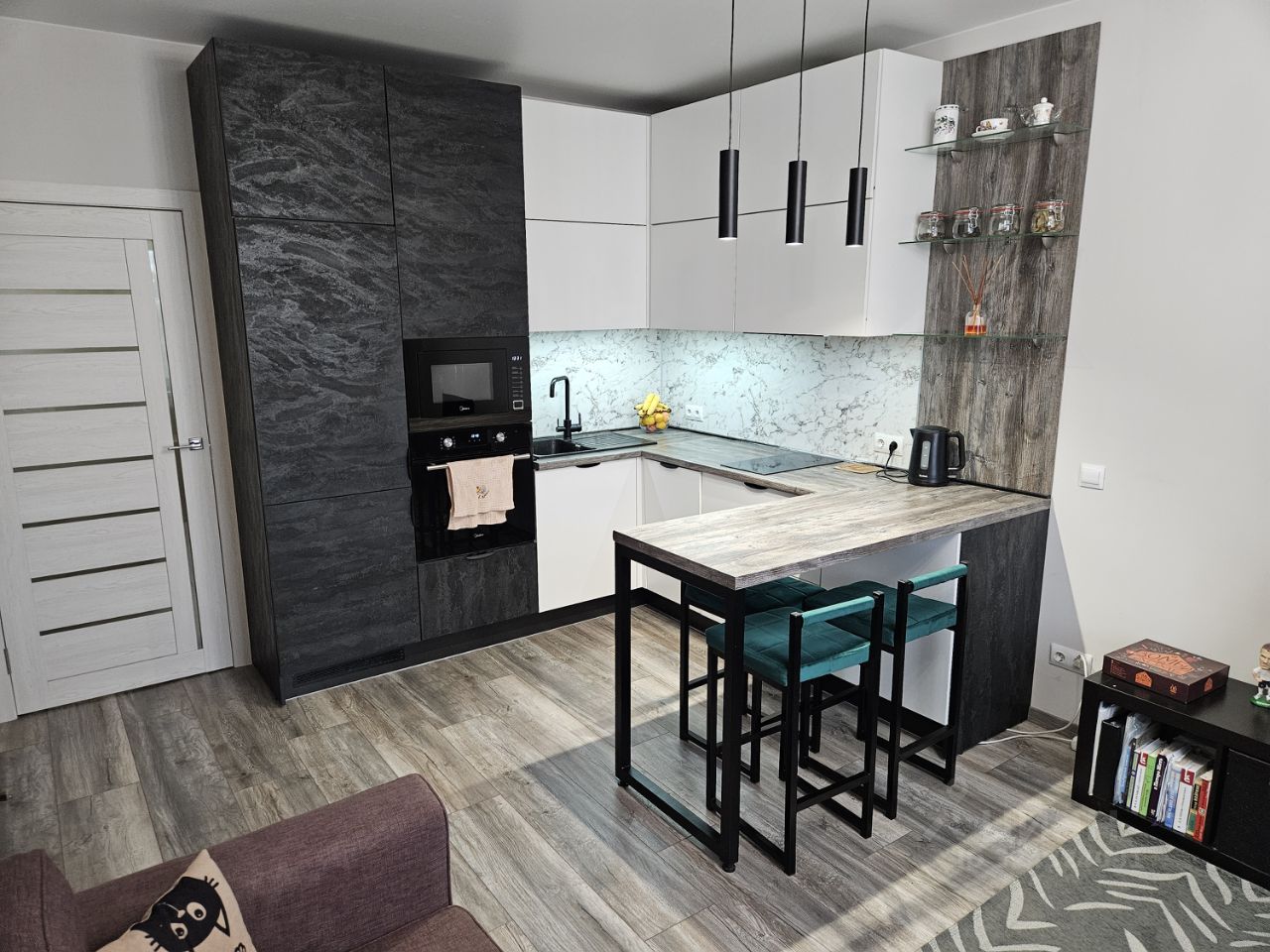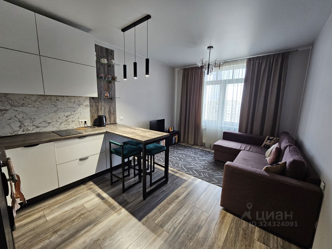 Кухня-гостиная 17,2 кв.м., отдельная комната площадью 12 кв.м., гардеробная 3,1 кв.м., совмещенный санузел 4,7 кв.м.