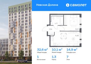 Строим кварталы для жизни с заботой о будущем. Предлагается 1-комнатная квартира комфорт-класса 32,57 кв.м в корпусе 1.3 на 7 этаже, в ЖК "Невская Долина"
