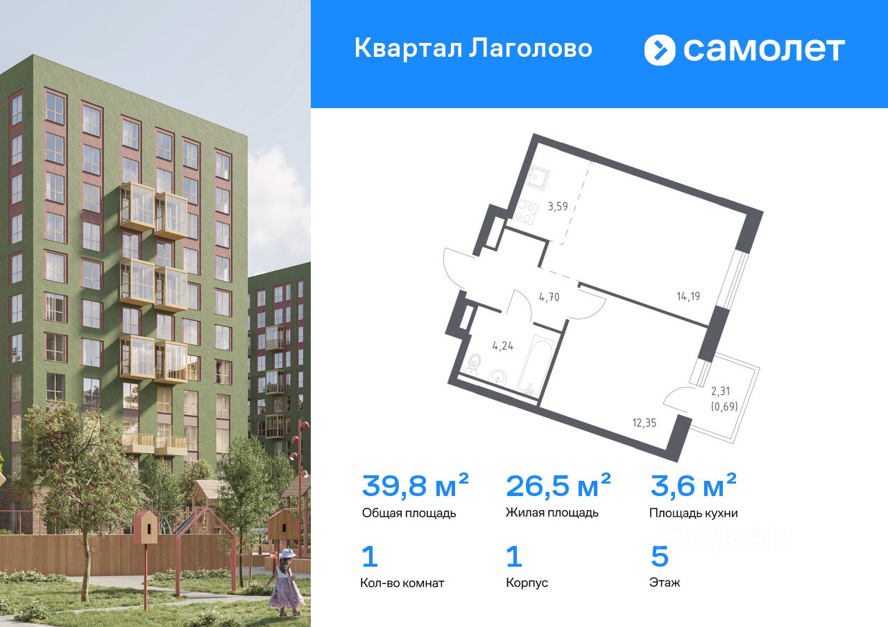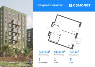 Строим кварталы для жизни с заботой о будущем. Предлагается 1-комнатная квартира комфорт-класса 39,76 кв.м в корпусе 1 на 5 этаже, в ЖК "Квартал Лаголово"