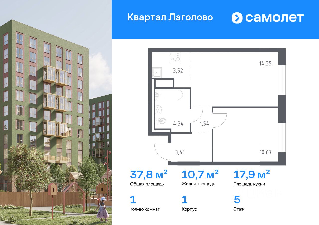 Строим кварталы для жизни с заботой о будущем. Предлагается 1-комнатная квартира комфорт-класса 37,83 кв.м в корпусе 1 на 5 этаже, в ЖК "Квартал Лаголово"