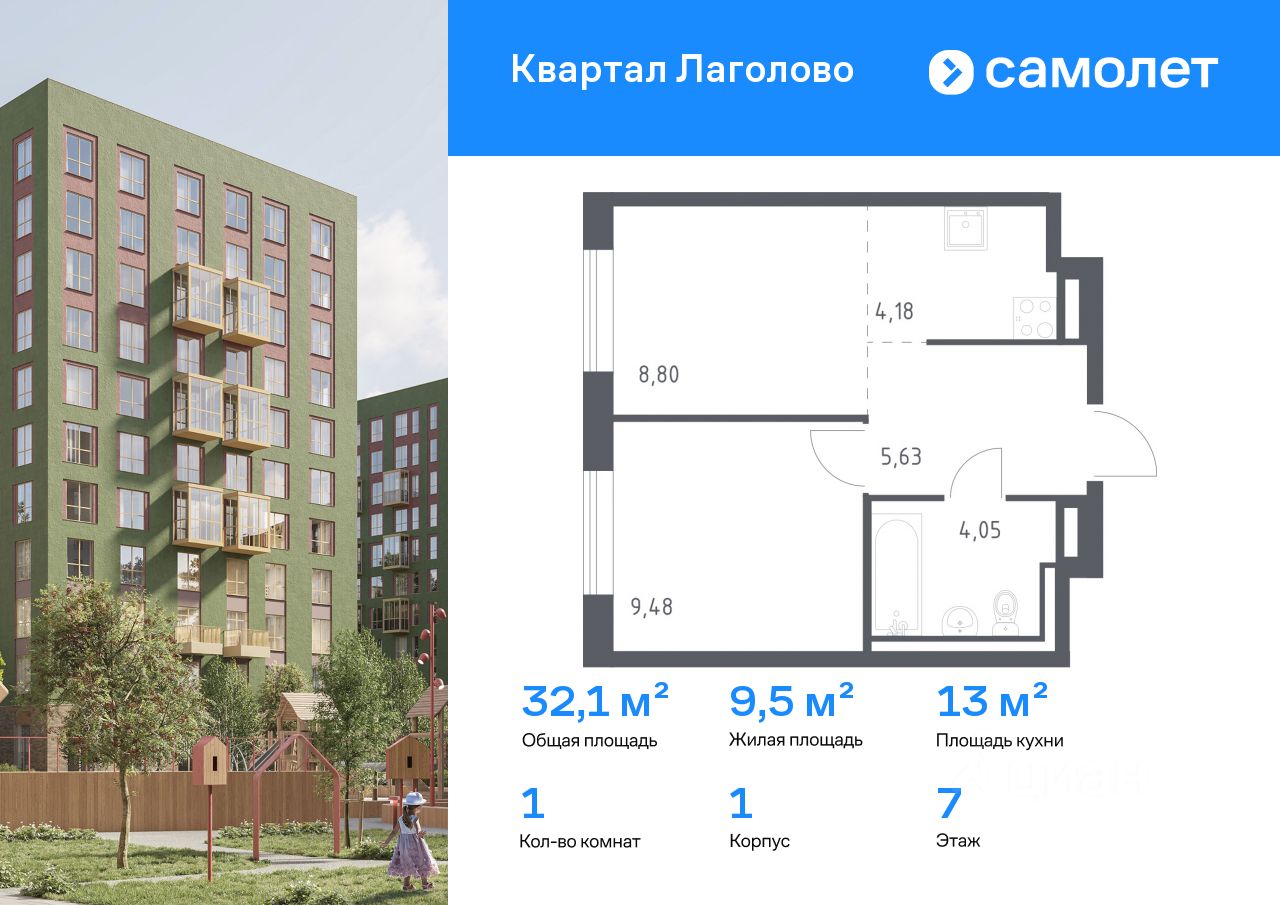 Строим кварталы для жизни с заботой о будущем. Предлагается 1-комнатная квартира комфорт-класса 32,14 кв.м в корпусе 1 на 7 этаже, в ЖК "Квартал Лаголово"