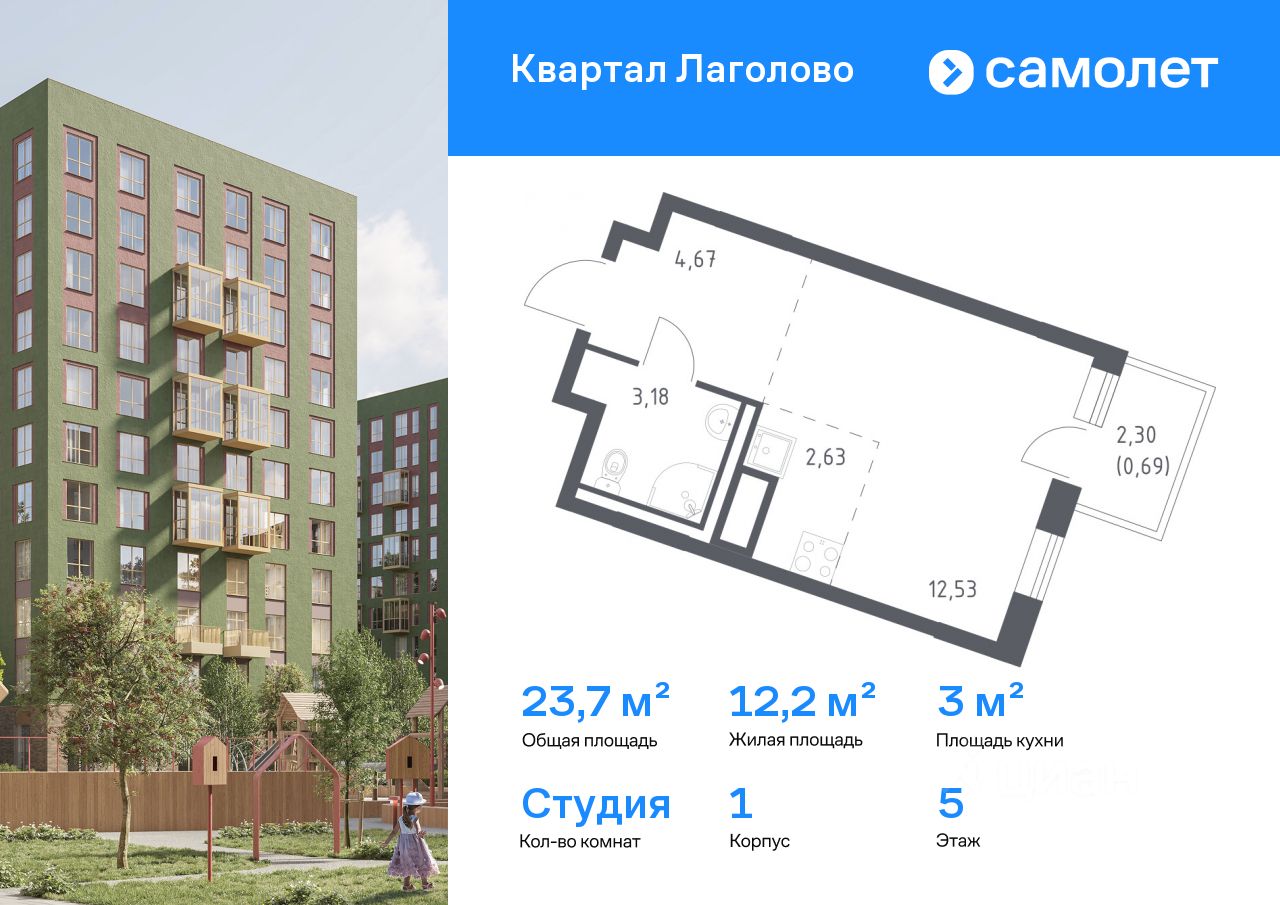 Строим кварталы для жизни с заботой о будущем. Предлагается квартира студия комфорт-класса 23,7 кв.м в корпусе 1 на 5 этаже, в ЖК "Квартал Лаголово"