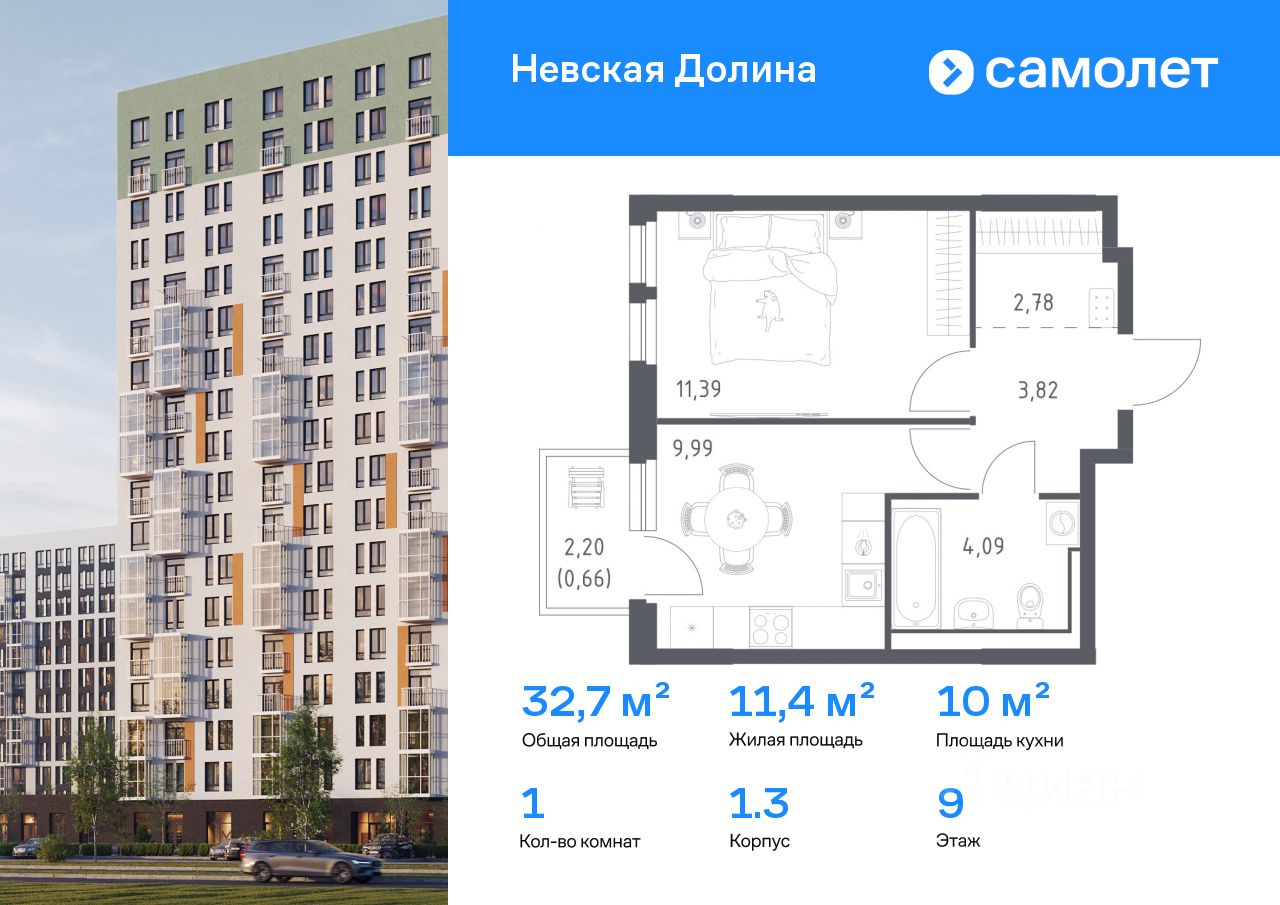 Строим кварталы для жизни с заботой о будущем. Предлагается 1-комнатная квартира комфорт-класса 32,73 кв.м в корпусе 1.3 на 9 этаже, в ЖК "Невская Долина"