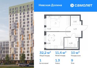 Строим кварталы для жизни с заботой о будущем. Предлагается 1-комнатная квартира комфорт-класса 32,21 кв.м в корпусе 1.3 на 9 этаже, в ЖК "Невская Долина"