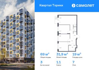 Строим кварталы для жизни с заботой о будущем. Предлагается 3-комнатная квартира комфорт-класса 69,02 кв.м в корпусе 1.1 на 7 этаже, в ЖК "Квартал Торики"