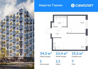Строим кварталы для жизни с заботой о будущем. Предлагается 1-комнатная квартира комфорт-класса 34,48 кв.м в корпусе 1.1 на 7 этаже, в ЖК "Квартал Торики"