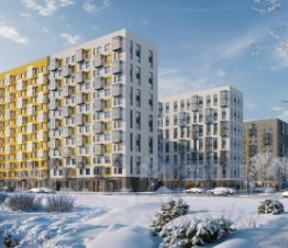Современные монолитные дома высотой 12 этажей выполнены в нейтральной цветовой гамме с яркими акцентами.