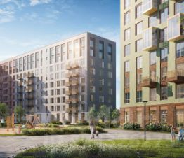 Дома высотой до 11 этажей с панорамными балконами выполнены в скандинавском стиле.