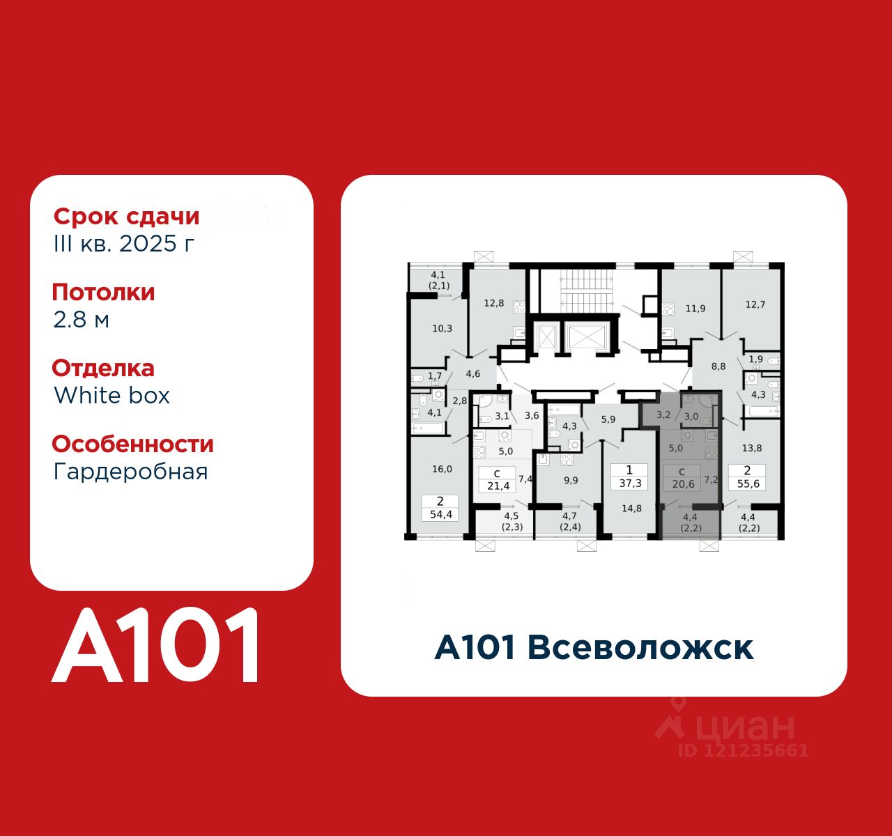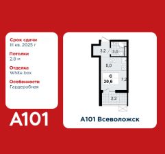 Студия площадью 20.70 в ЖК "А101 Всеволожск" c лоджией на 3 этаже. Квартира white box. Вид из окна во двор. В квартире 1 санузел. Высота потолков 2.8 м. Особенность планировки - гардеробная.