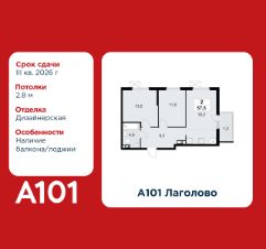 2-комнатная квартира площадью 57.50 в ЖК "А101 Лаголово" c лоджией на 9 этаже. Квартира с отделкой. Вид из окна на улицу. В квартире 1 санузел. Высота потолков 2.8 м.
