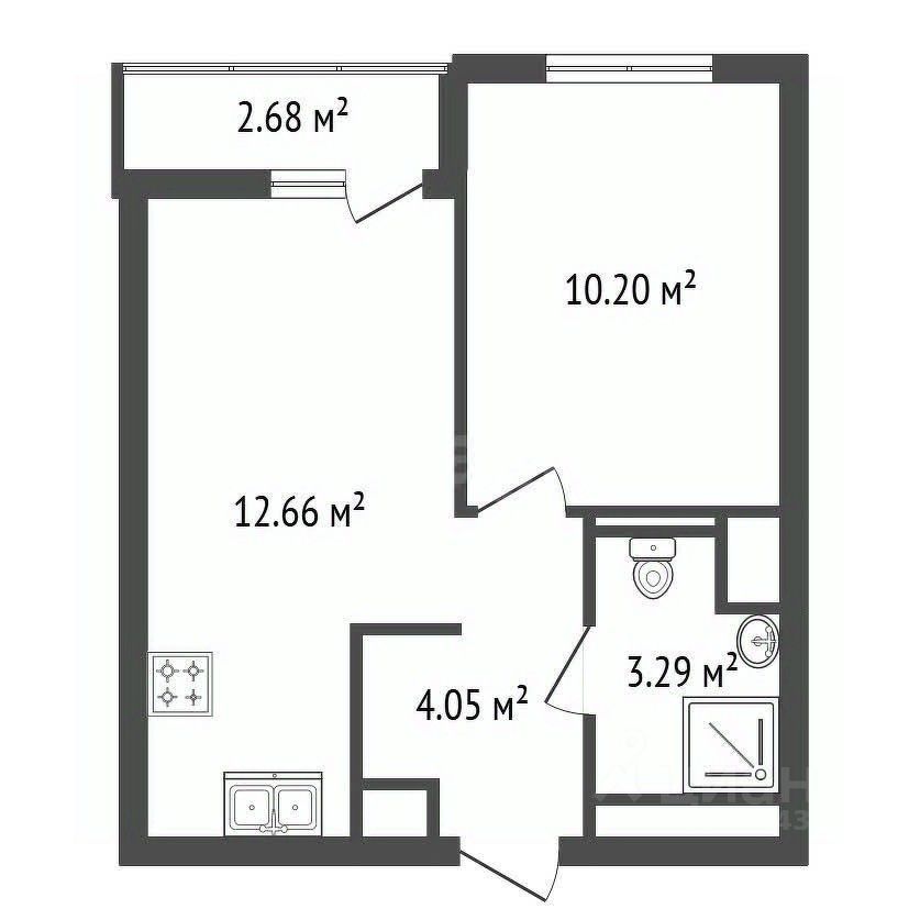 Планировка отличается продуманностью: изолированная комната 10,20 м² обеспечивает уединение, а просторная кухня-гостиная 12,66 м² объединена с застекленной лоджией 2,68 м², формируя светлое и функциональное пространство для отдыха.