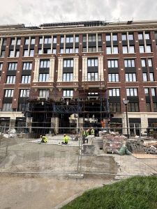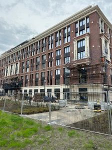 Во дворе также есть амфитеатр с широкими деревянными ступенями.