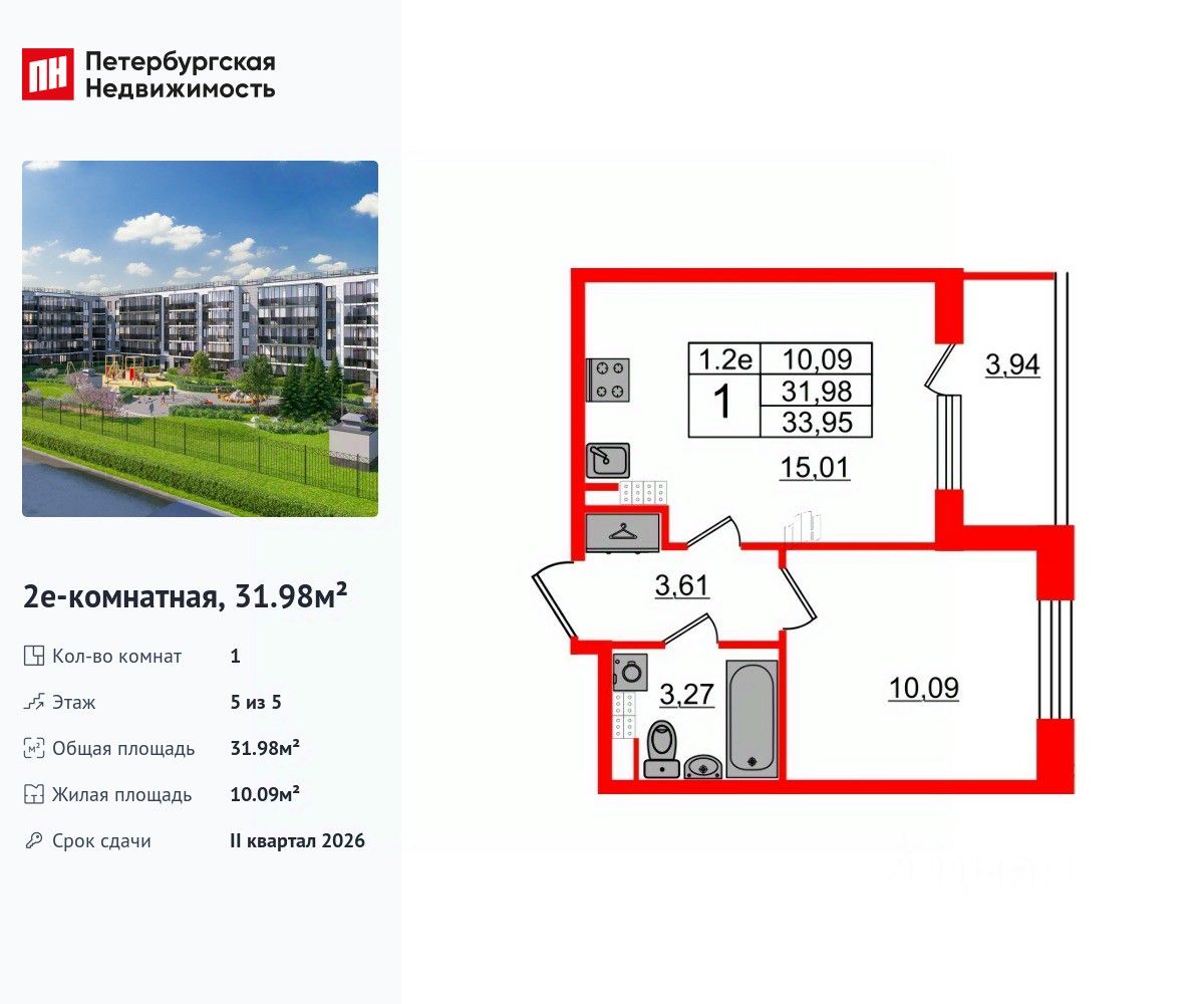 Удобная, классическая, функциональная европланировка, большая кухня-гостиная 15.01 м², вместительная прихожая 3.61 м². Общая площадь квартиры - 31.98 м², жилая 10.09 м², высота потолка 3.07 м.