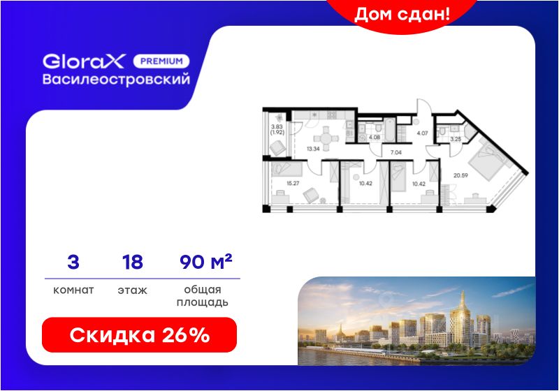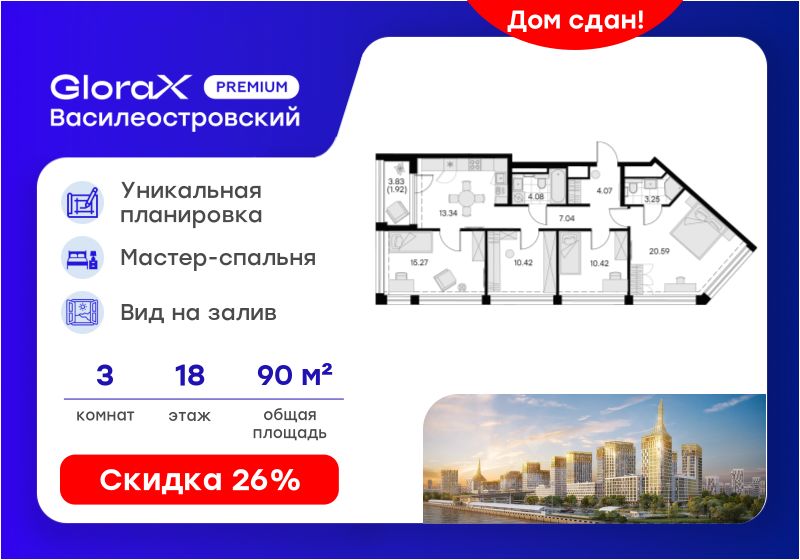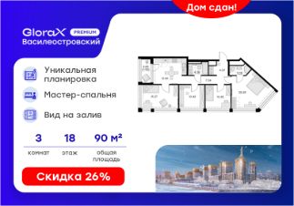 Продается 3-комн. квартира на 18-м этаже в строящемся проекте премиум-класса GloraX Premium Василеостровский. Общая площадь лота составляет 90,40 кв. м, из которых 46,28 кв. м отведено под жилую и 13,34 кв. м под кухонную зону.