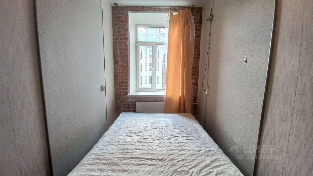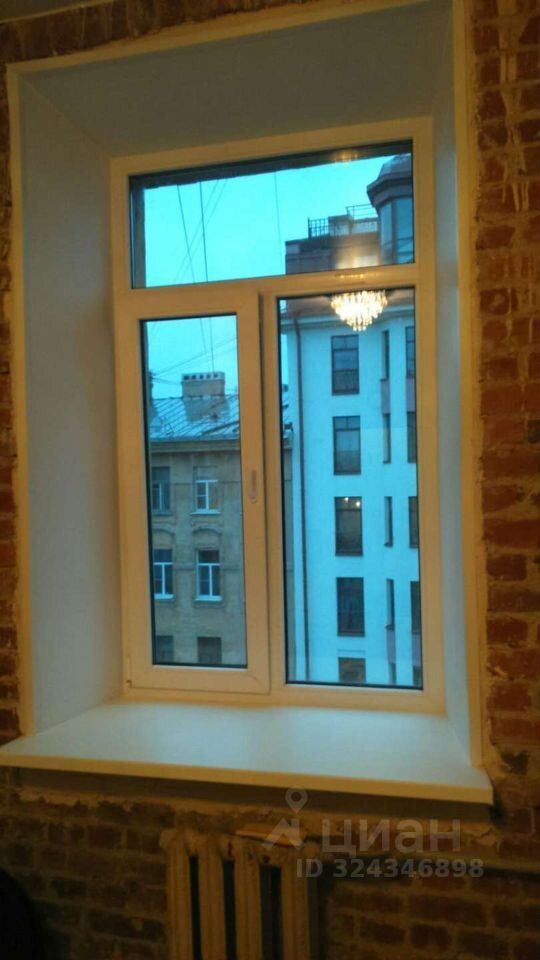 В комнате сохранена старая кирпичная кладка. Пластиковое окно с огромным подоконником выходит на спокойную 14-ю линию.