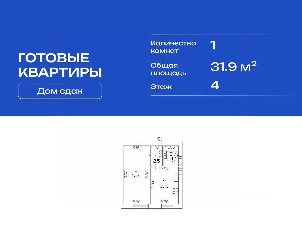 Продается квартира в сданном жилом комплексе на 4 этаже в девятиэтажном кирпичном доме. Общая площадь 31.90 кв. м.