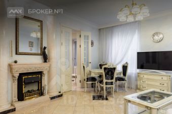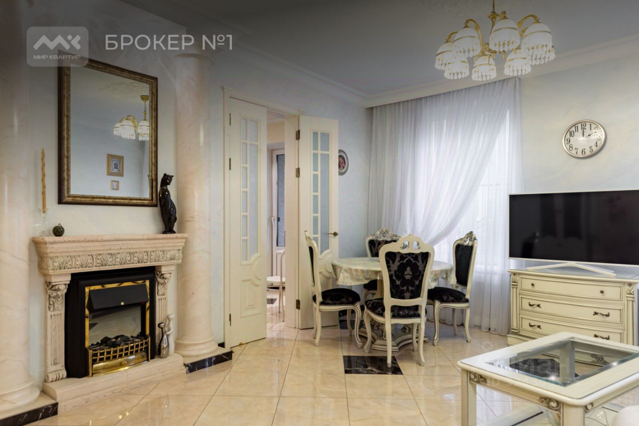 Интересное зонирование квартиры: светлая гостиная в 2 окна с камином, отдельно небольшая кухню с застекленным балконом, зона кабинета -библиотеки, 2 сан. узла, гардеробная и просторная спальня в 2 окна.