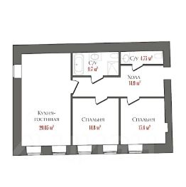 Эта просторная резиденция включает две светлые комнаты с продуманной и функциональной планировкой: просторный холл с отдельной комнатой для гардероба, две уютные спальни, светлая кухня-гостиная и совмещенный санузел.
