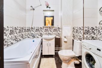 -Совмещенный санузел выполнен в лаконичных оттенках, сочетая в себе светлую и темную керамическую плитку.