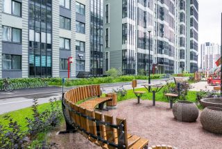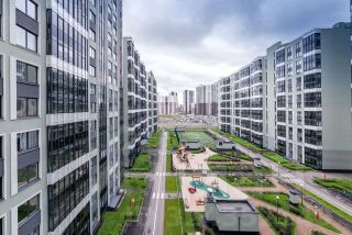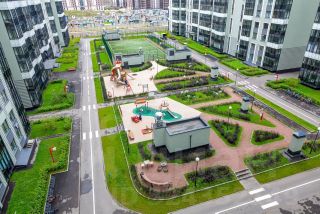 Закрытый двор без машин со своими детскими и спортивной площадками.