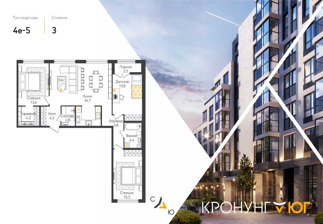 Кронунг ЮГ- современный жилой комплекс комфорт-класса на берегу реки Дудергофки. Невысокая этажность, современная архитектура. Благоустроенный внутренний двор будет включать в себя спортивные площадки, в том числе памп-трек, места для отдыха, прогулочную набережную, детские игровые площадки, места для выгула собак, шезлонги вдоль берега реки Дудергофки. Для автомобилей предусмотрен трехэтажный отдельно стоящий паркинг и парковочные места с зарядными станциями для электромобилей на территории ЖК.