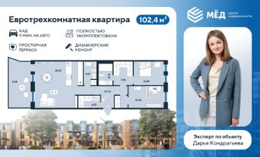 Семейная квартира с качественным новым ремонтом, большой кухней-гостинной с террасой, в доме бизнес класса Veren Village Стрельна