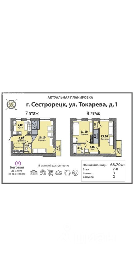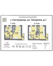 Продается трехкомнатная квартира 68.7м. Квартира двухэтажная (7 и 8 этаж дома), двухсторонняя, комнаты раздельные. Комната 16,1м, кухня 7м и сан.узел находятся на первом этаже, комнаты 13,3м, 11,1м и сан.узел - на втором, на каждом этаже застекленный балкон. Очень уютная, светлая, теплая квартира в кирпичном доме!