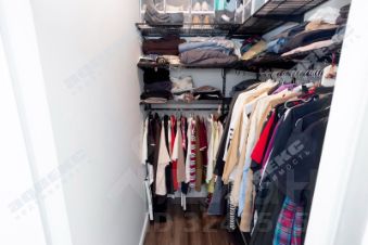 В спальне построена гардеробная комната.
