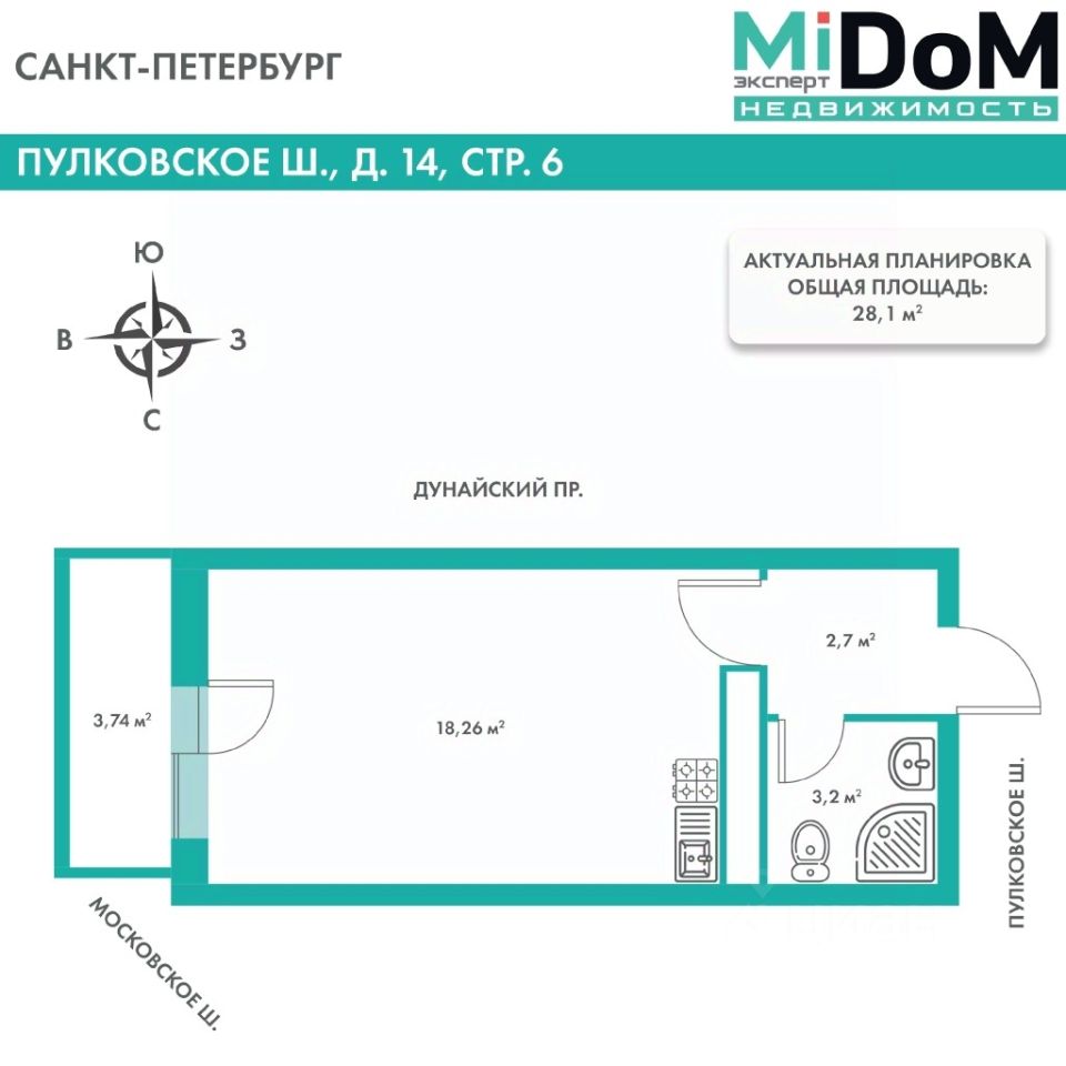 Арт. 72858628. ПРОСТОРНАЯ студия 28,1 м² в апарт-комплексе "Салют". 14 этаж. Метро Звездная.
