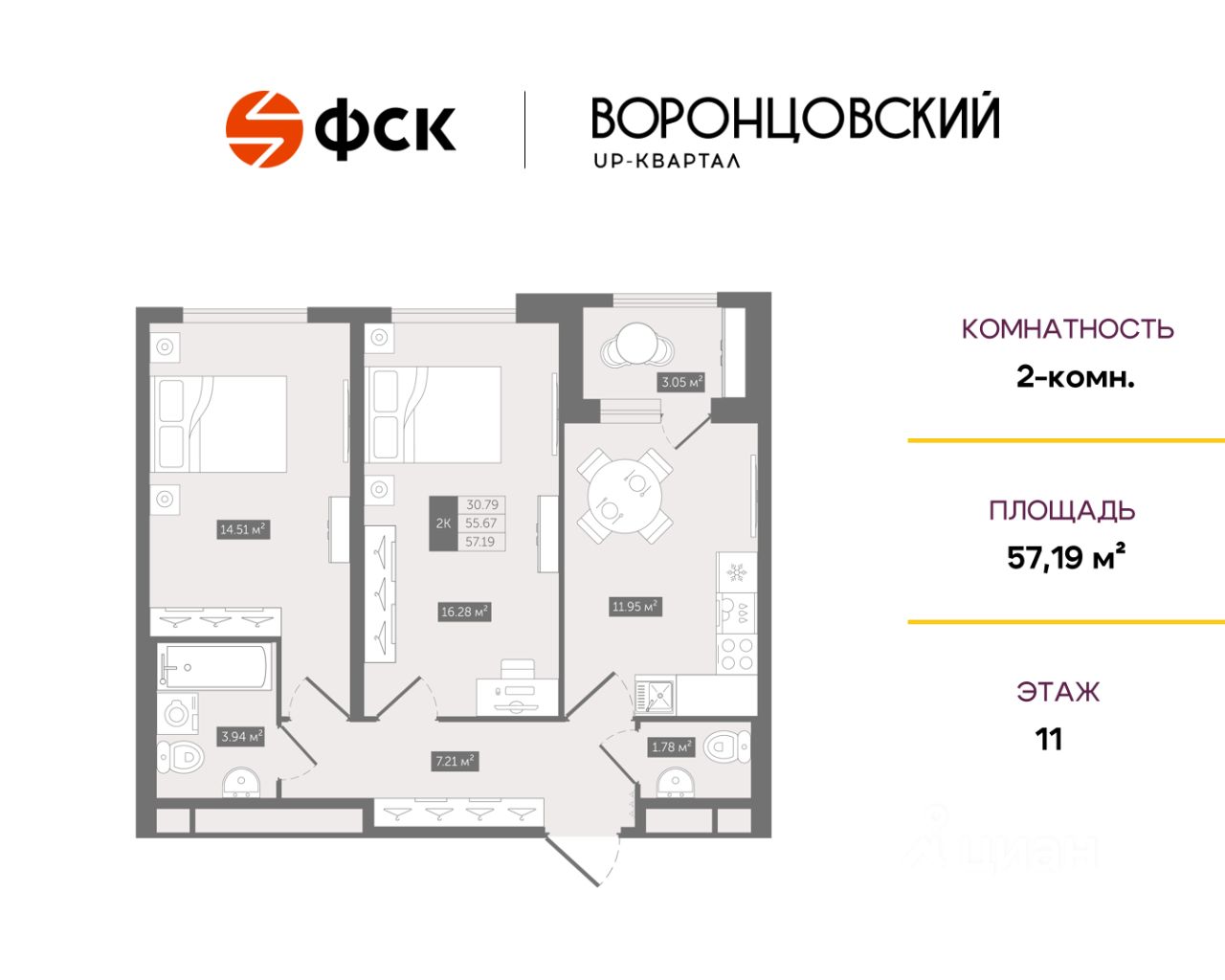 Цена со скидкой до 30% в прямой продаже от застройщика — только в этом месяце. Беспроцентная рассрочка. 2-к квартира в ЖК UP-квартал "Воронцовский" на 11-м этаже. Общая площадь 57,19. Чистовая отделка.