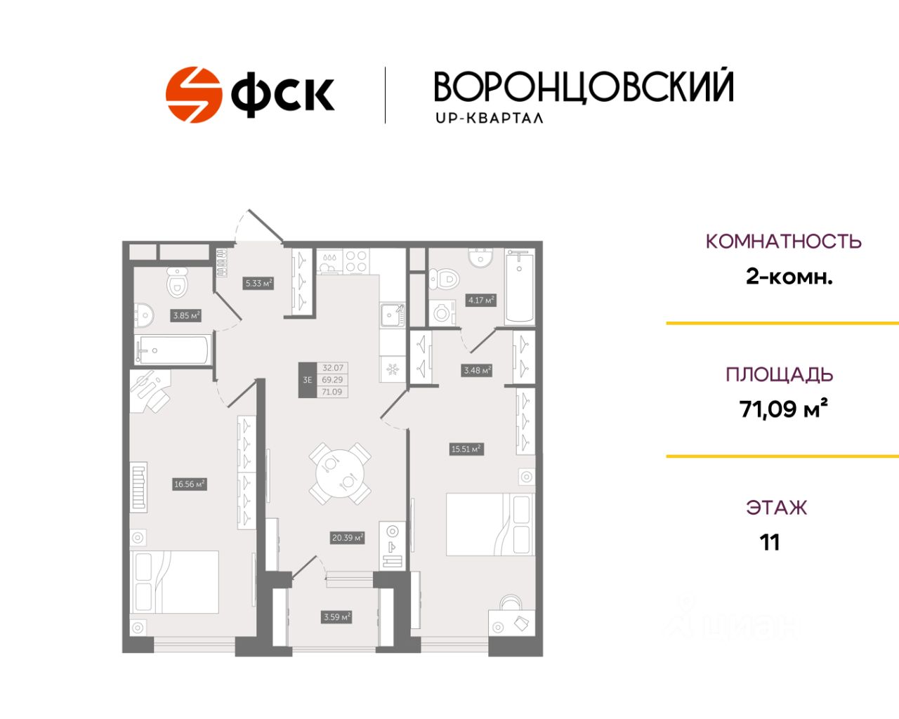 Цена со скидкой до 30% в прямой продаже от застройщика — только в этом месяце. Беспроцентная рассрочка. 2-к квартира в ЖК UP-квартал "Воронцовский" на 11-м этаже. Общая площадь 71,09. Чистовая отделка.
