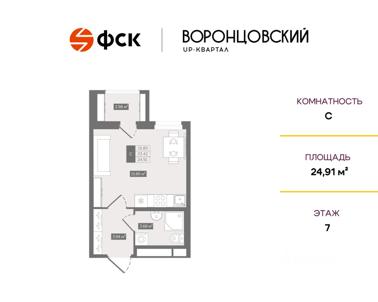 Общая площадь24,91 м²