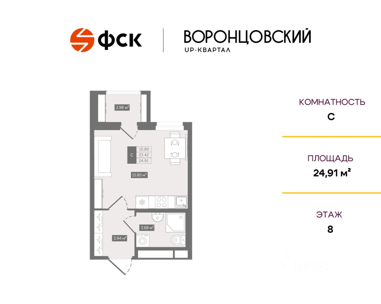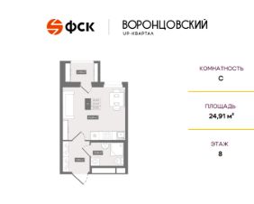 Цена со скидкой до 30% в прямой продаже от застройщика — только в этом месяце. Беспроцентная рассрочка. Студия в ЖК UP-квартал "Воронцовский" на 8-м этаже. Общая площадь 24,91. Без отделки.