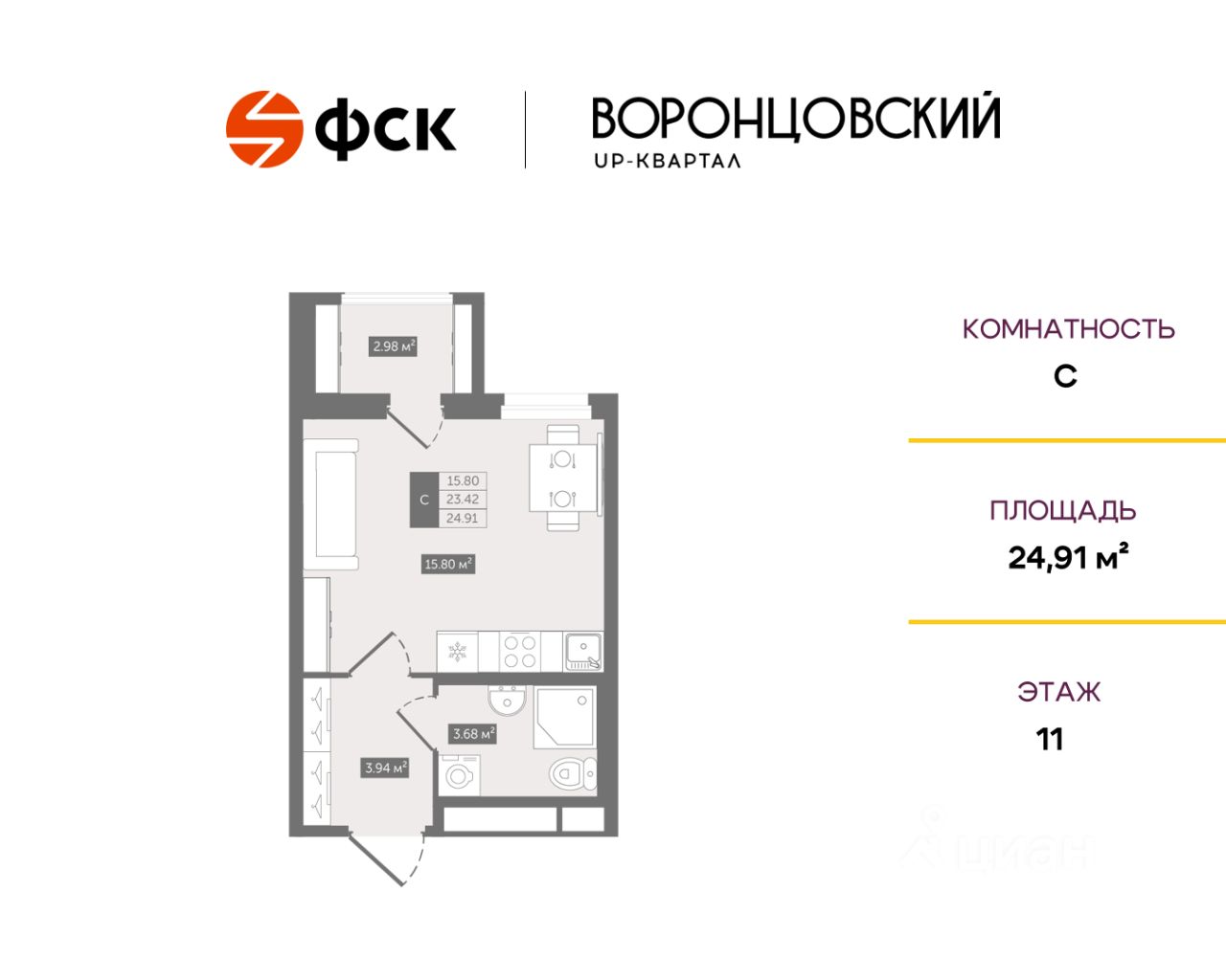 Цена со скидкой до 30% в прямой продаже от застройщика — только в этом месяце. Беспроцентная рассрочка. Студия в ЖК UP-квартал "Воронцовский" на 11-м этаже. Общая площадь 24,91. Без отделки.