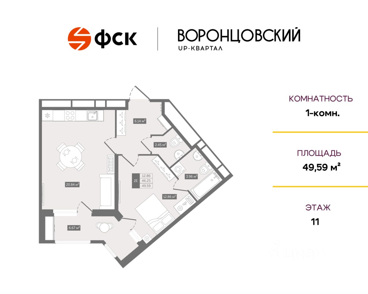 Цена со скидкой до 30% в прямой продаже от застройщика — только в этом месяце. Беспроцентная рассрочка. 1-к квартира в ЖК UP-квартал "Воронцовский" на 11-м этаже. Общая площадь 49,59. Без отделки.