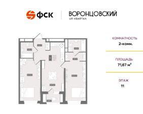 Цена со скидкой до 30% в прямой продаже от застройщика — только в этом месяце. Беспроцентная рассрочка. 2-к квартира в ЖК UP-квартал "Воронцовский" на 11-м этаже. Общая площадь 71,67. Без отделки.