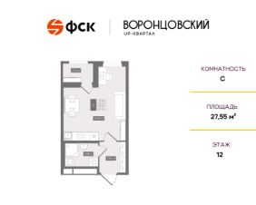 Цена со скидкой до 30% в прямой продаже от застройщика — только в этом месяце. Беспроцентная рассрочка. Студия в ЖК UP-квартал "Воронцовский" на 12-м этаже. Общая площадь 27,55. Без отделки.