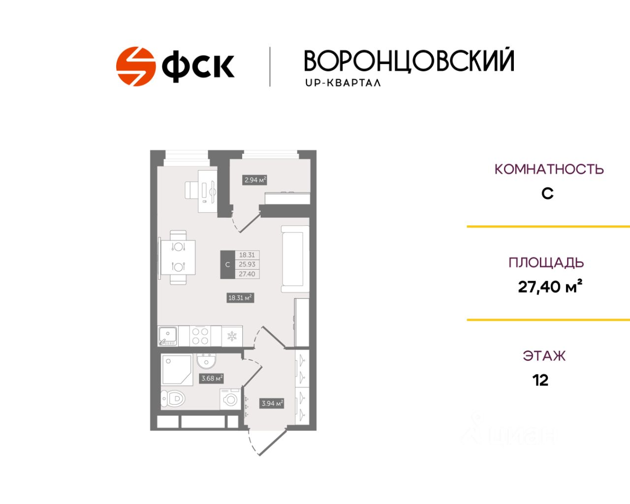 Цена со скидкой до 30% в прямой продаже от застройщика — только в этом месяце. Беспроцентная рассрочка. Студия в ЖК UP-квартал "Воронцовский" на 12-м этаже. Общая площадь 27,4. Без отделки.