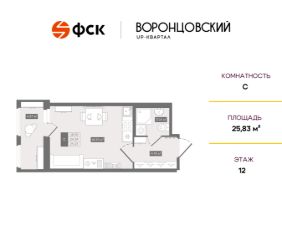 Цена со скидкой до 30% в прямой продаже от застройщика — только в этом месяце. Беспроцентная рассрочка. Студия в ЖК UP-квартал "Воронцовский" на 12-м этаже. Общая площадь 25,83. Без отделки.
