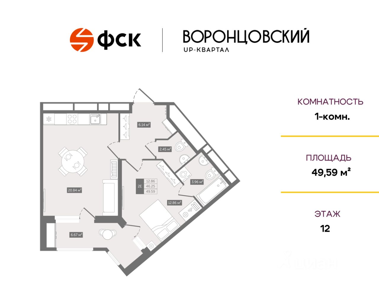 Цена со скидкой до 30% в прямой продаже от застройщика — только в этом месяце. Беспроцентная рассрочка. 1-к квартира в ЖК UP-квартал "Воронцовский" на 12-м этаже. Общая площадь 49,59. Без отделки.