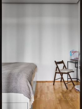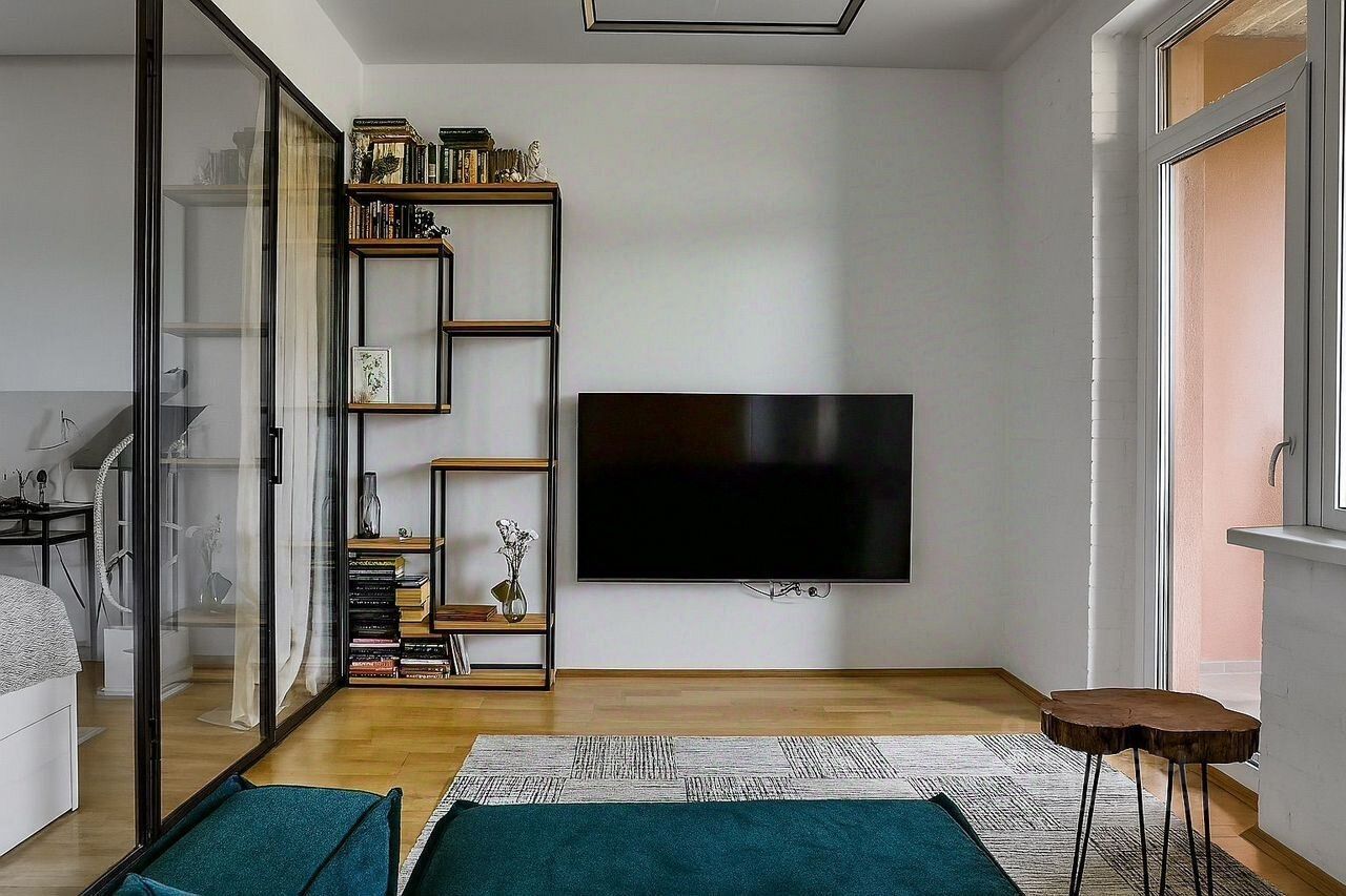 Спальня 8,72 м², которая огорожена стеклянной перегородкой.