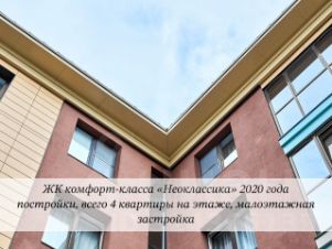 ЖК комфорт-класса Неоклассика 2020 года постройки, в состав которого входят три четырехэтажных монолитно-каркасных дома. В ЖК по 4 квартиры на этаж, с просторными мопами и грузовыми лифтами Otis. Комплекс входит в состав микрорайона На Царскосельских холмах.