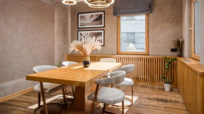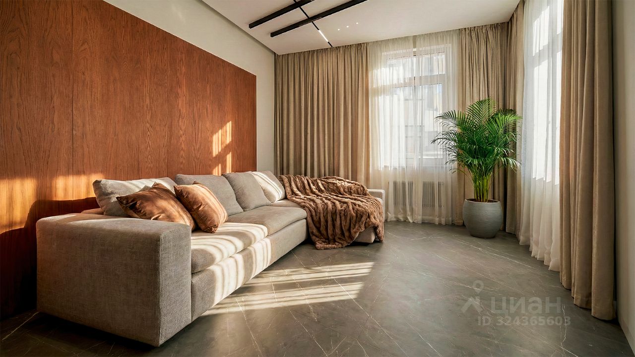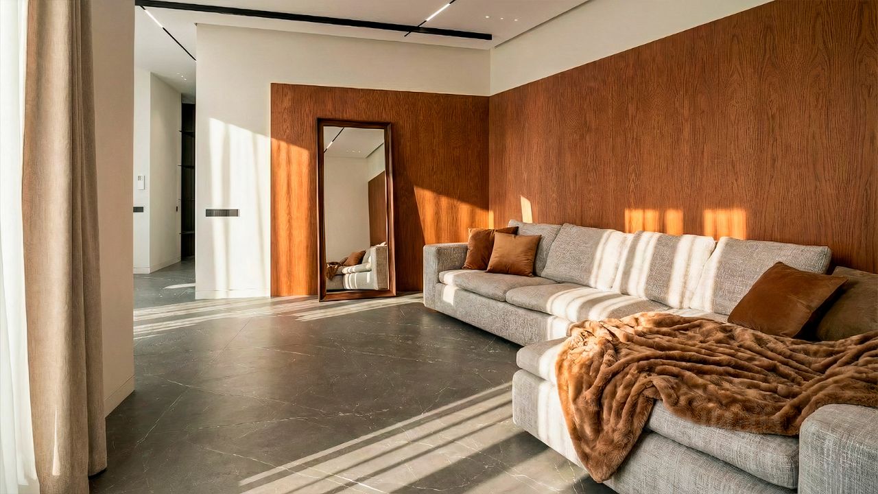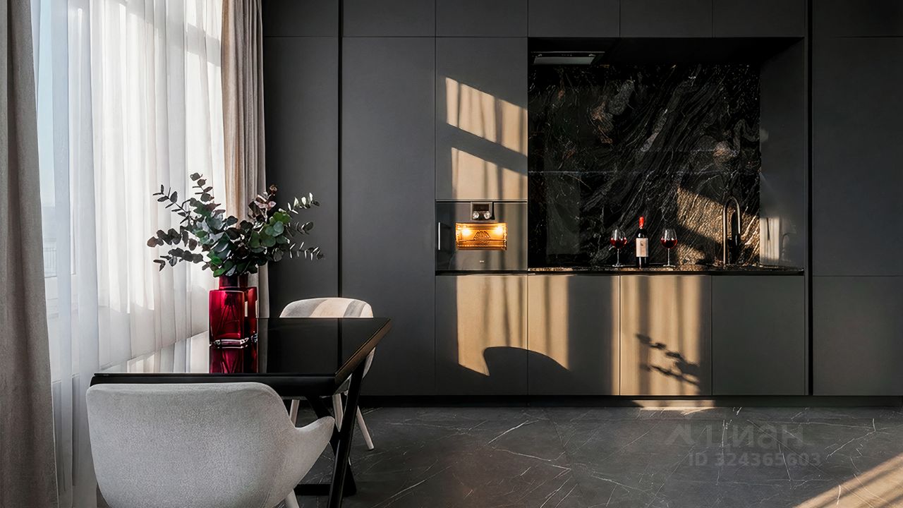 Ремонт в квартире выполнен из натуральных европейских материалов: камень, дерево, широкоформатный керамогранит, увеличенные двери итальянского бренда Rimadesio, техника премиального уровня немецкой марки Gaggenau.
