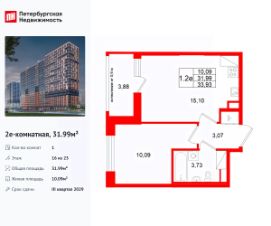 Удобная, классическая, функциональная европланировка, большая кухня-гостиная 15.1 м², вместительная прихожая 3.07 м². Общая площадь квартиры - 31.99 м², жилая 10.09 м², высота потолка 2.77 м.