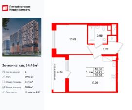 Удобная, классическая, функциональная европланировка, большая кухня-гостиная 17.09 м², вместительная прихожая 3.19 м². Общая площадь квартиры - 34.43 м², жилая 10.06 м², высота потолка 2.77 м.