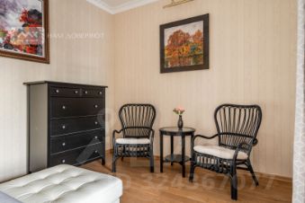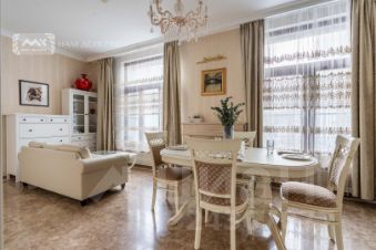 Квартиры имеет необычную планировку, выделена небольшая рабочая площадь кухни с выходом в большую гостиную, окна которой выходят на большую придомовую террасу и зелёный двор. Одна из спален поделена на комнату отдыха и непосредственно спальную зону.