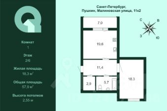 Продается просторная евродвушка 57 м² в историческом сердце Пушкина!