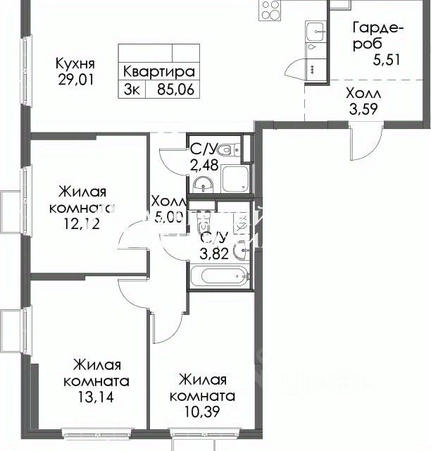 3 изолированные комнаты: 12.12, 13.14, 10.39 м2