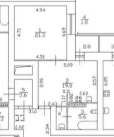 Общая площадь - 47,7 кв м. Площадь комнаты - 21,3 кв.м., кухня - 19 кв.м., совмещённый санузел, лоджия. Высота потолков - 2,9 м.